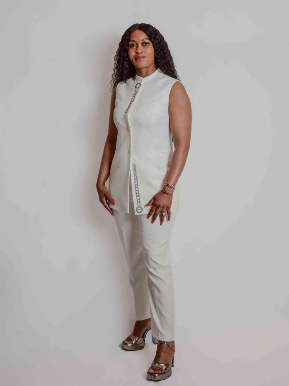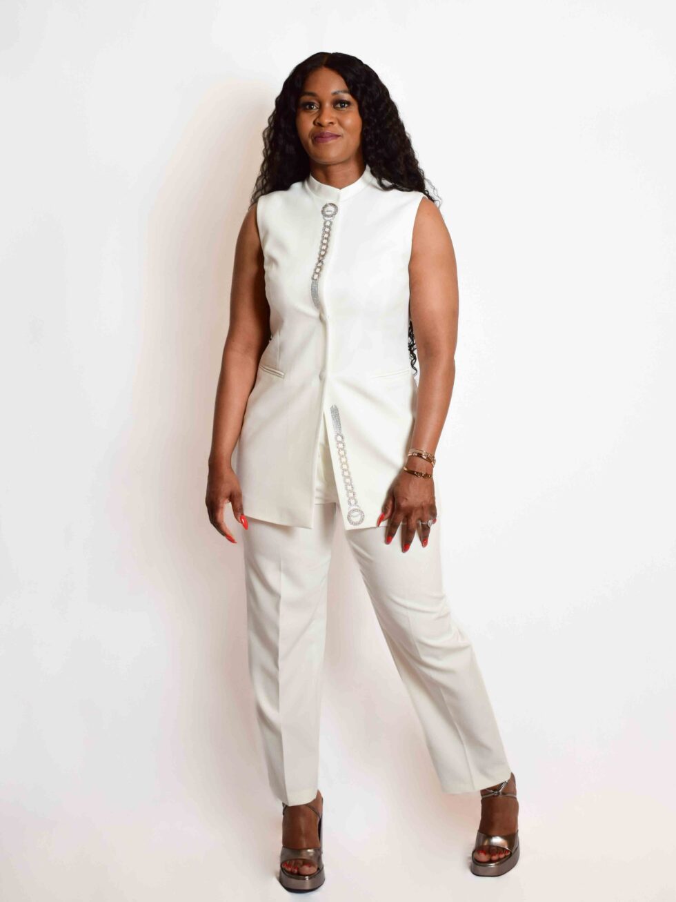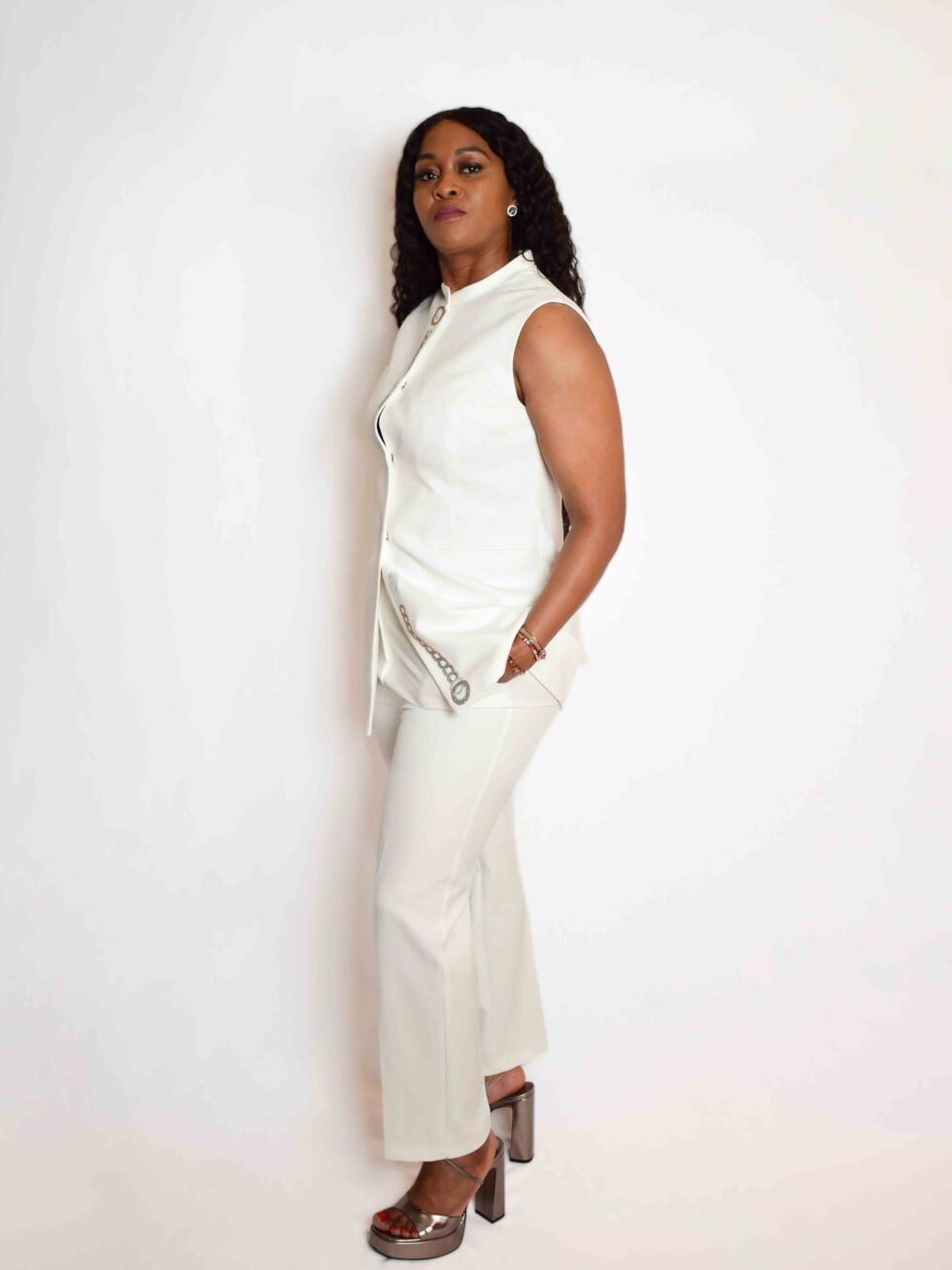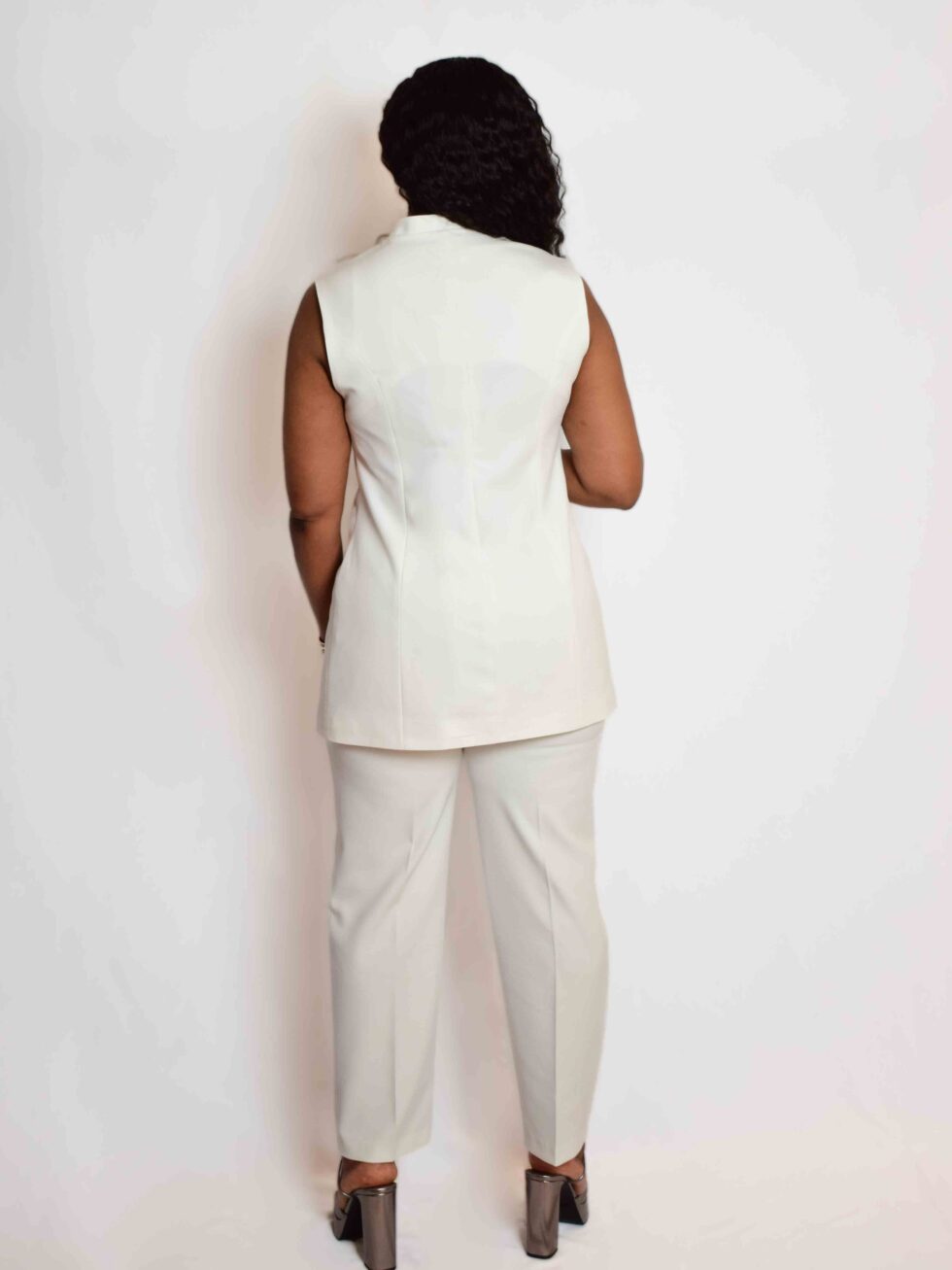 A chic and modern white pantsuit featuring a sleeveless tailored top with a high neckline and decorative buttons down the front. The minimalist design is complemented by slim-fit trousers for a sleek and professional look. Ideal for business meetings, weddings or stylish evening occasions.