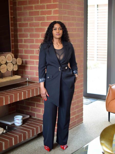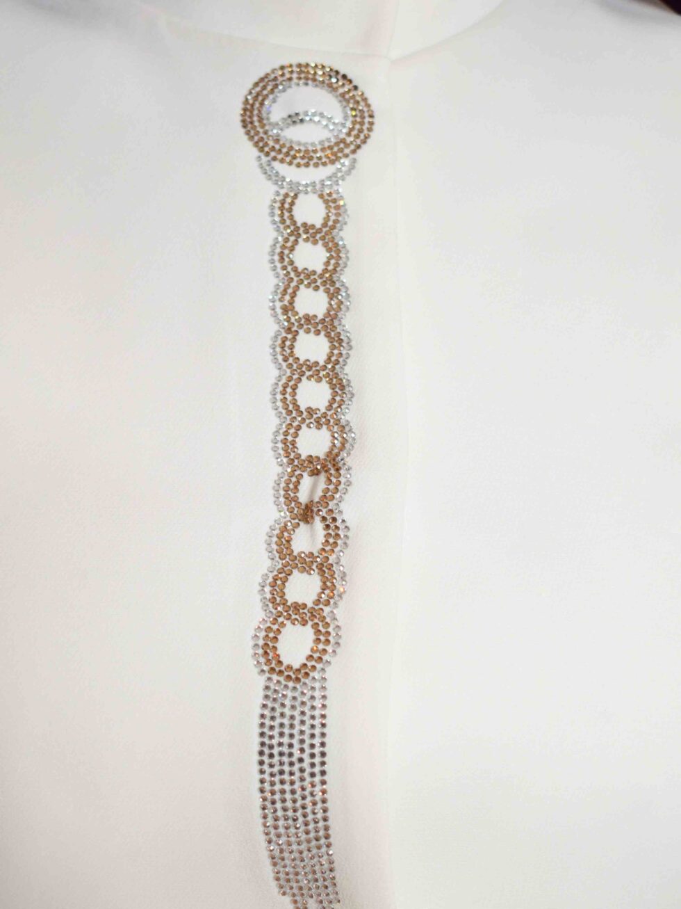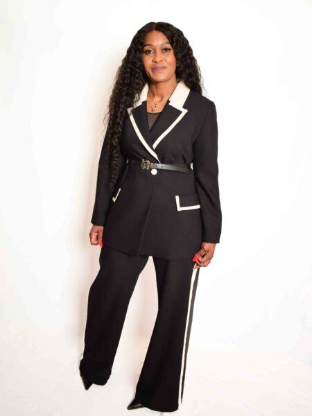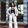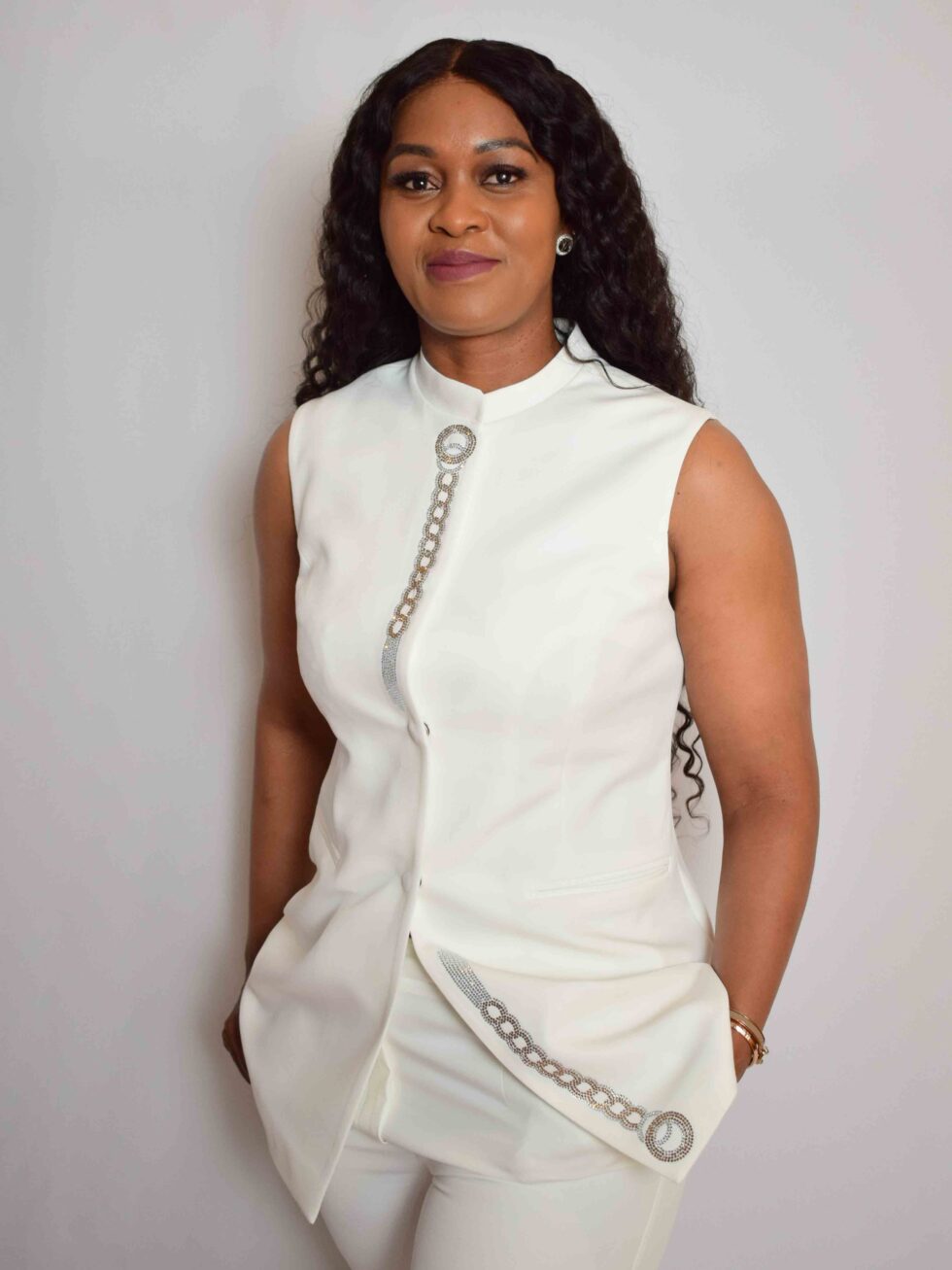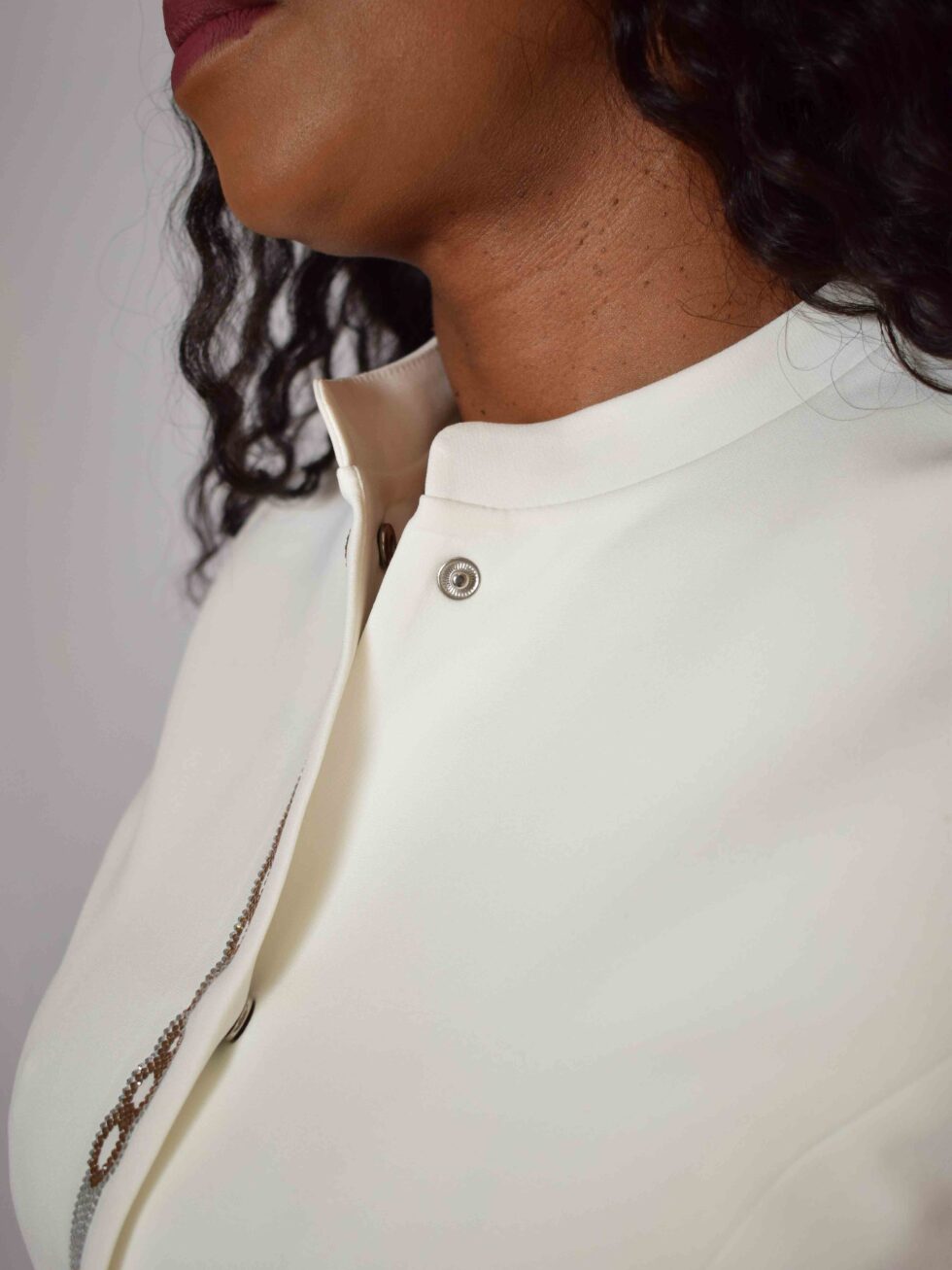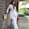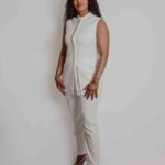 A chic and modern white pantsuit featuring a sleeveless tailored top with a high neckline and decorative buttons down the front. The minimalist design is complemented by slim-fit trousers for a sleek and professional look. Ideal for business meetings, weddings or stylish evening occasions.