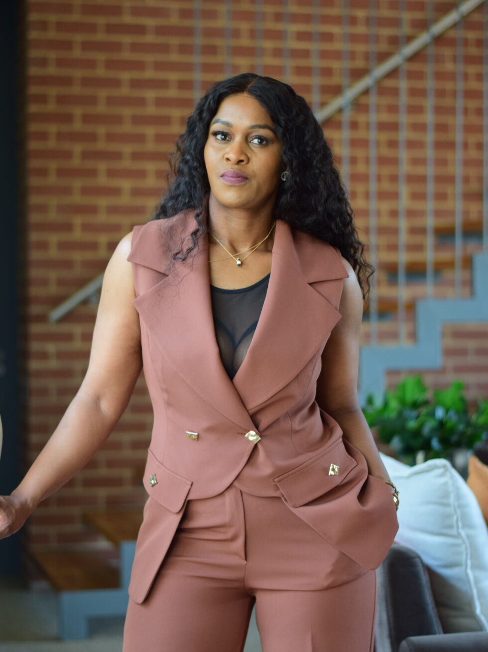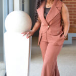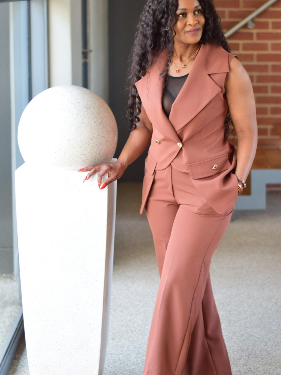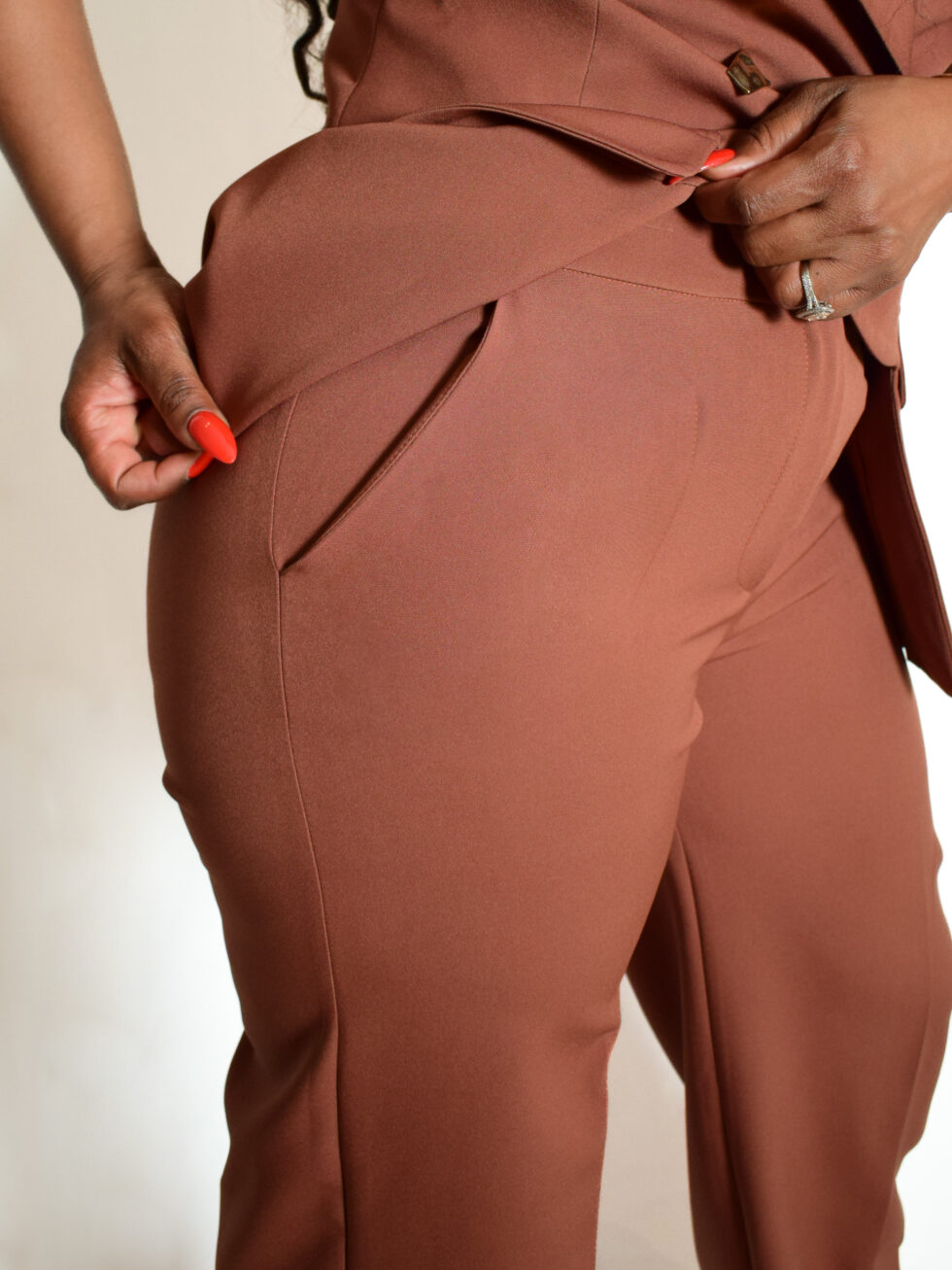 This chic pantsuit features a sleeveless rust colored blazer with a structured, tailored fit. The blazer includes pointed lapels, gold-toned button details, and flap pockets that add elegance and functionality. It is paired with wide-leg trousers for a sophisticated, contemporary look. Perfect for formal events, business meetings, or professional gatherings, this outfit blends confidence and style seamlessly.