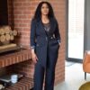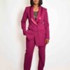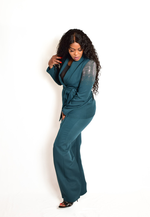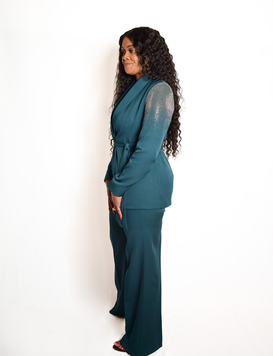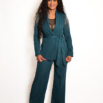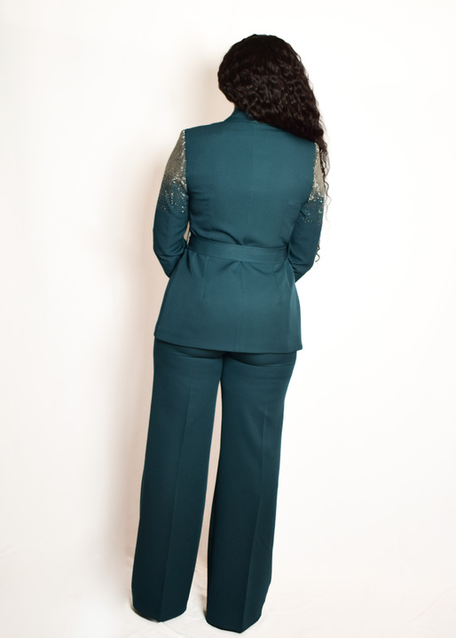 A sophisticated teal/emerald pantsuit with a wrap-style blazer adorned with subtle embellishments on the shoulders. The structured fit and wide-leg trousers combine elegance with confidence, perfect for formal or semi-formal occasions.