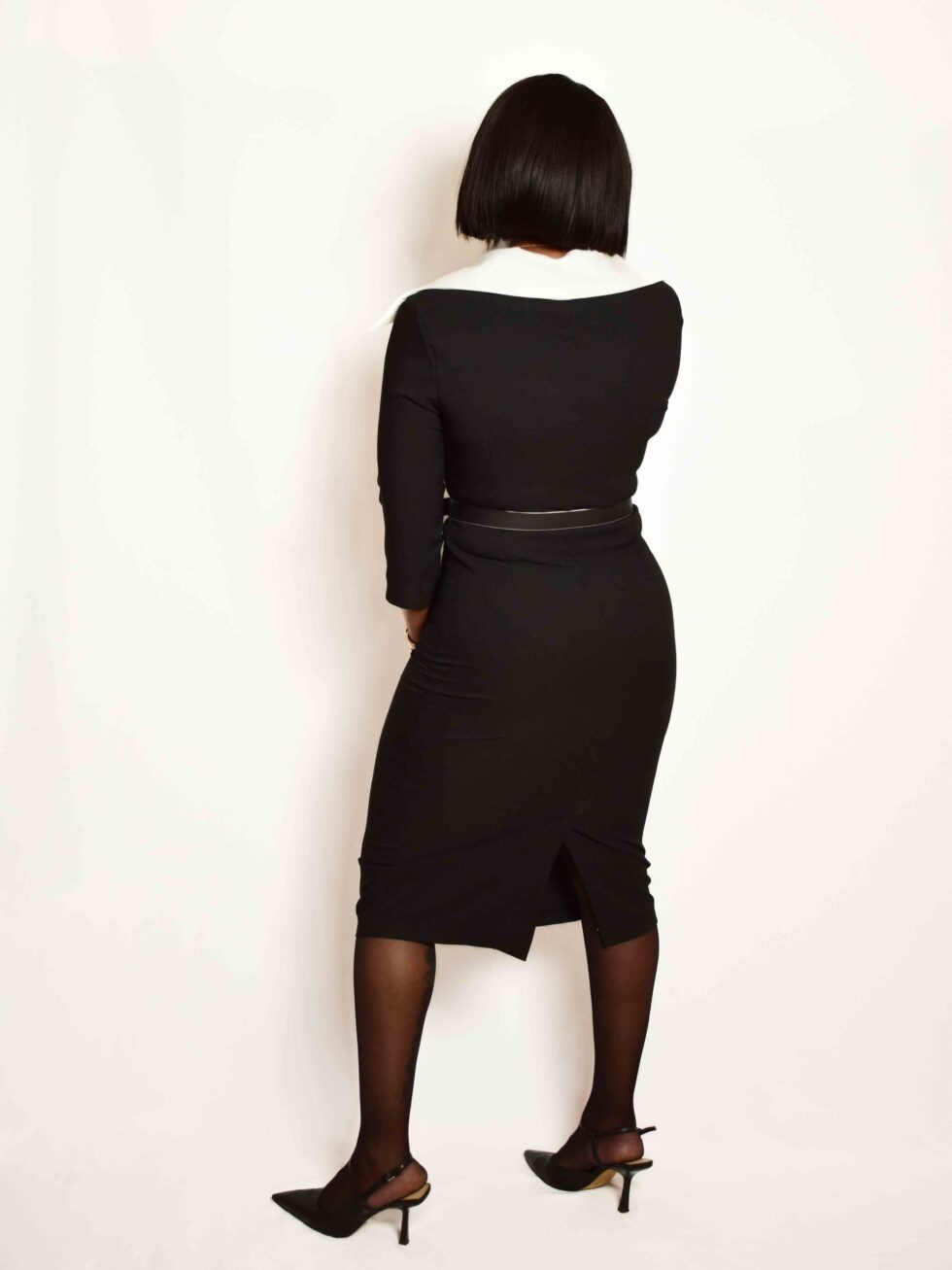 This knee-length black dress exudes sophistication with its bold white lapel collar. Designed with a form-fitting silhouette, it includes a matching belt that cinches at the waist, enhancing the hourglass figure. The button details add a subtle classic touch, making it perfect for professional or formal settings.